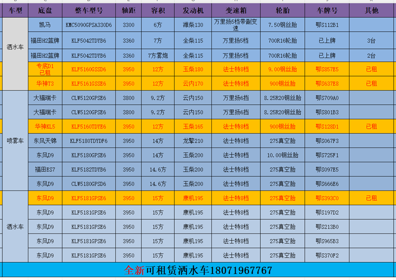 可租賃車型:全新灑水車、洗掃車、吸污車、吸糞車、掃路車、對(duì)接垃圾車、壓縮垃圾車、無(wú)泄露自裝卸式垃圾車、護(hù)欄清洗車、高壓清洗車、勾臂式壓縮垃圾車、移動(dòng)垃圾站、餐廚垃圾車、擺臂式垃圾車等等。